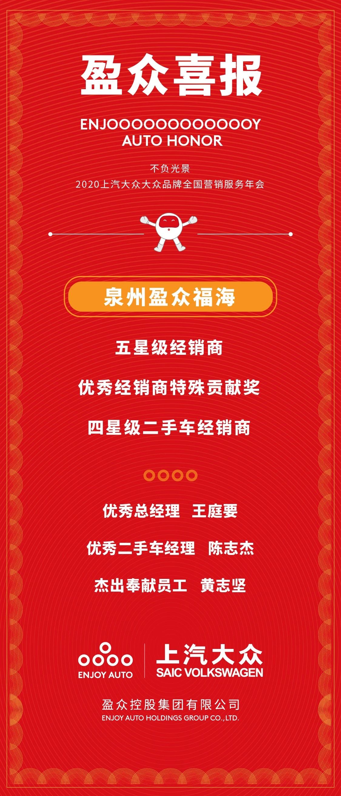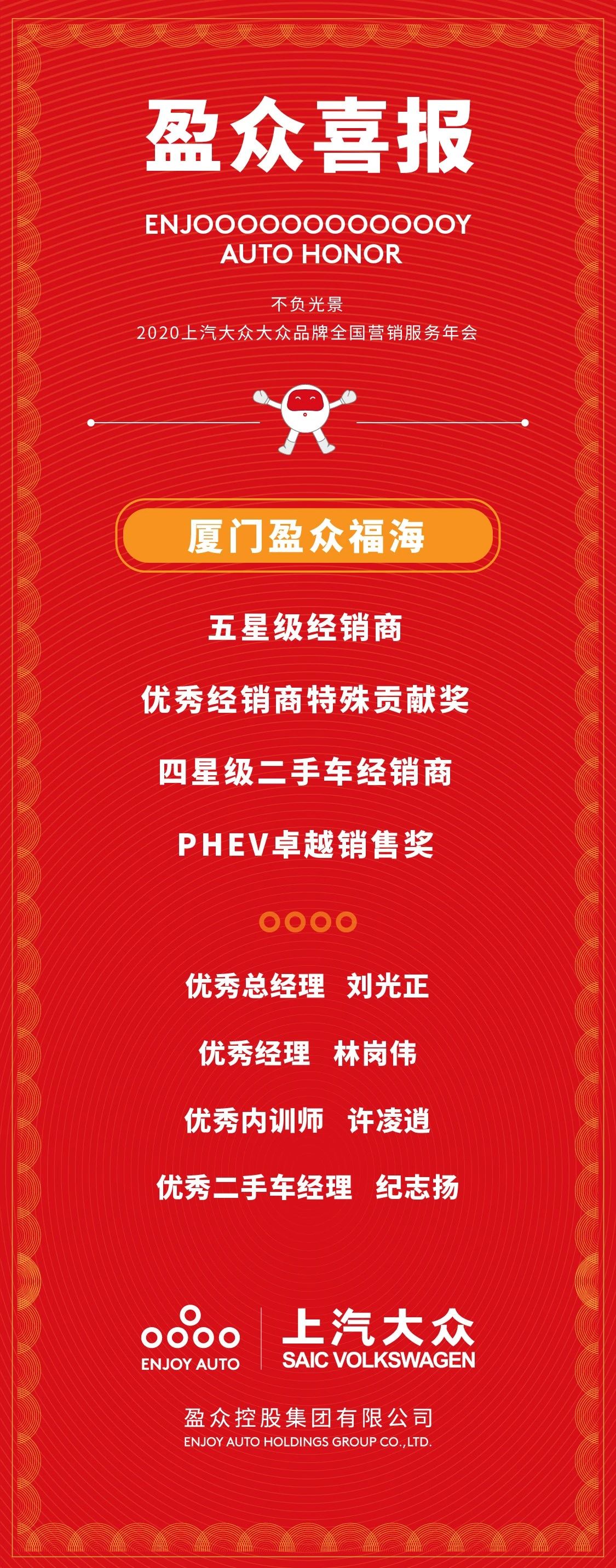熱烈祝賀盈眾旗下廈門(mén)福海、泉州福海4S店從全國(guó)1000多家上汽大眾經(jīng)銷(xiāo)商脫穎而出,榮獲多項(xiàng)殊榮。