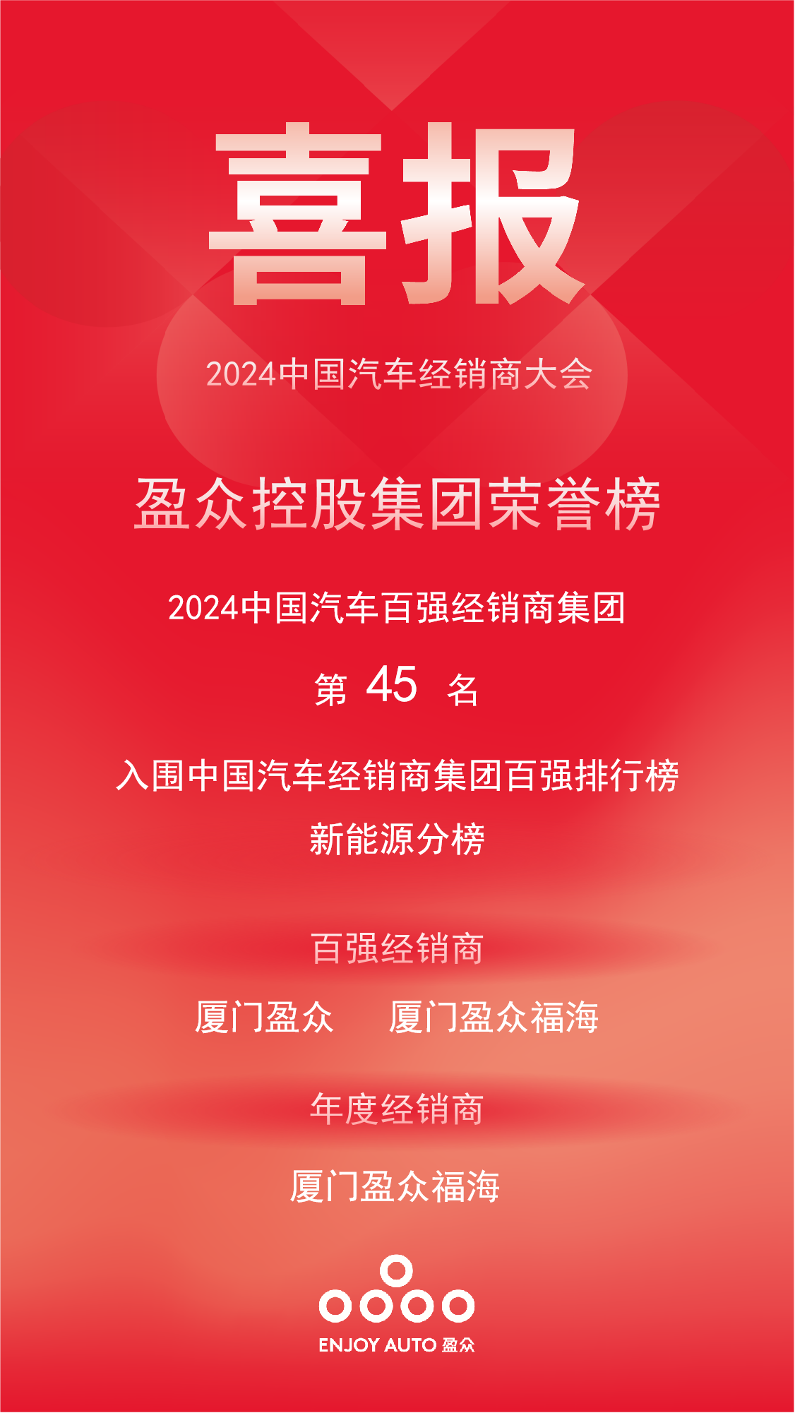 同時,盈眾控股集團還入圍“2024中國汽車經(jīng)銷商集團百強排行榜新能源分榜單”,旗下廈門盈眾及廈門盈眾福海榮獲“百強經(jīng)銷商”榮譽稱號,廈門盈眾福海入圍“年度經(jīng)銷商”。