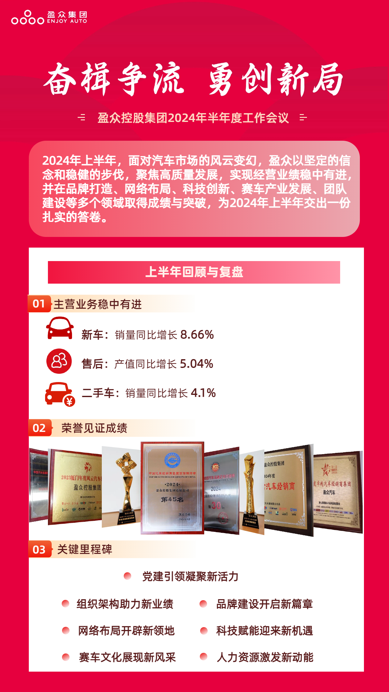 2024年上半年,面對汽車市場的風(fēng)云變幻,盈眾以堅(jiān)定的信念和穩(wěn)健的步伐,聚焦高質(zhì)量發(fā)展,實(shí)現(xiàn)經(jīng)營業(yè)績穩(wěn)中有進(jìn),新車、售后、二手車三大主營業(yè)務(wù)均實(shí)現(xiàn)同比增長。同時(shí),在品牌打造、網(wǎng)絡(luò)布局、科技創(chuàng)新、賽車產(chǎn)業(yè)發(fā)展、團(tuán)隊(duì)建設(shè)等多個(gè)領(lǐng)域取得成績與突破,為2024年上半年交出一份扎實(shí)的答卷。
