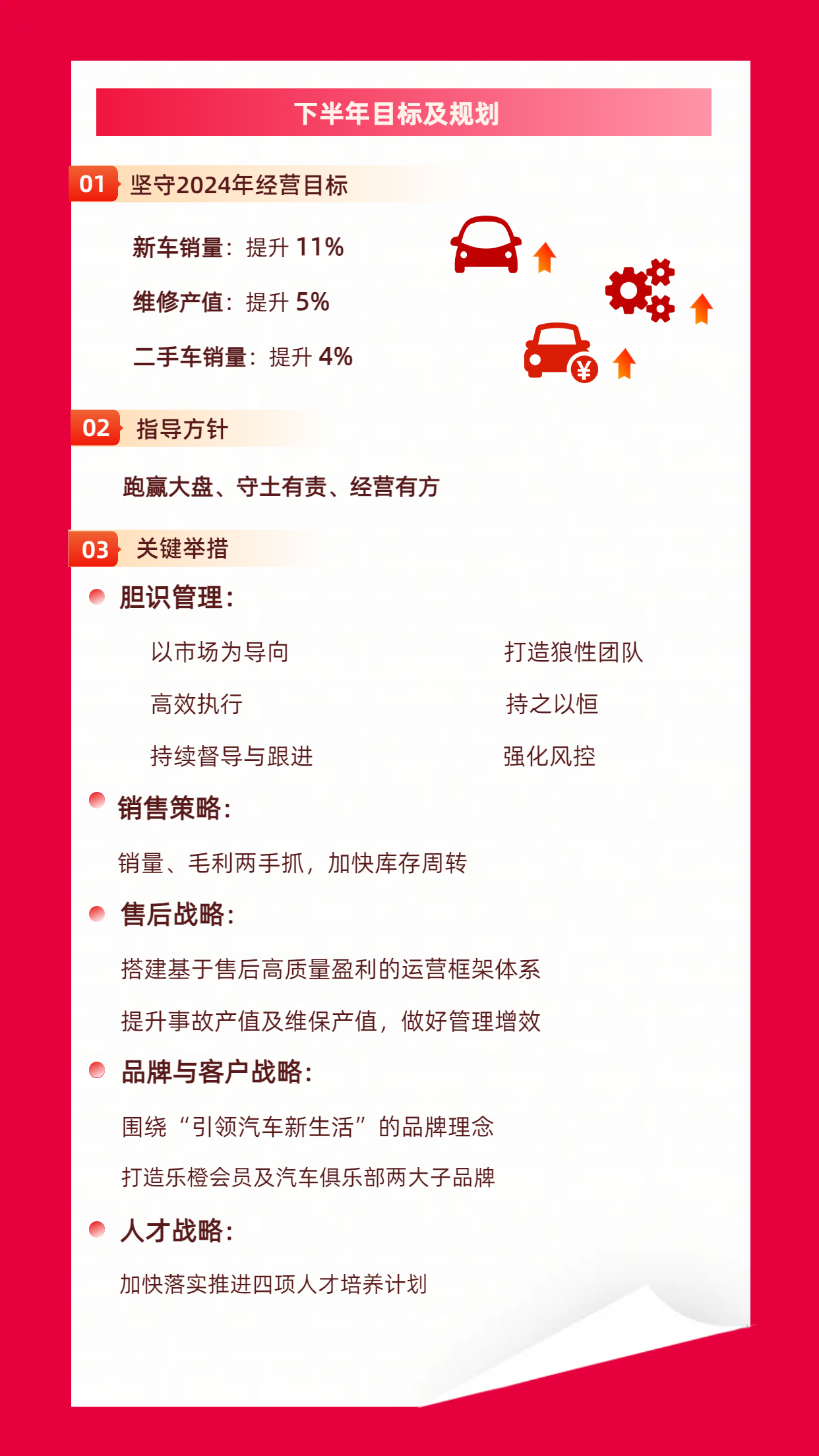 展望下半年,易總再次重申了2024年經(jīng)營目標(biāo),提出“跑贏大盤、守土有責(zé)、經(jīng)營有方”的指導(dǎo)方針,并圍繞膽識管理、銷售策略、售后策略、售后戰(zhàn)略、品牌與客戶戰(zhàn)略、人才戰(zhàn)略提出系列關(guān)鍵舉措。